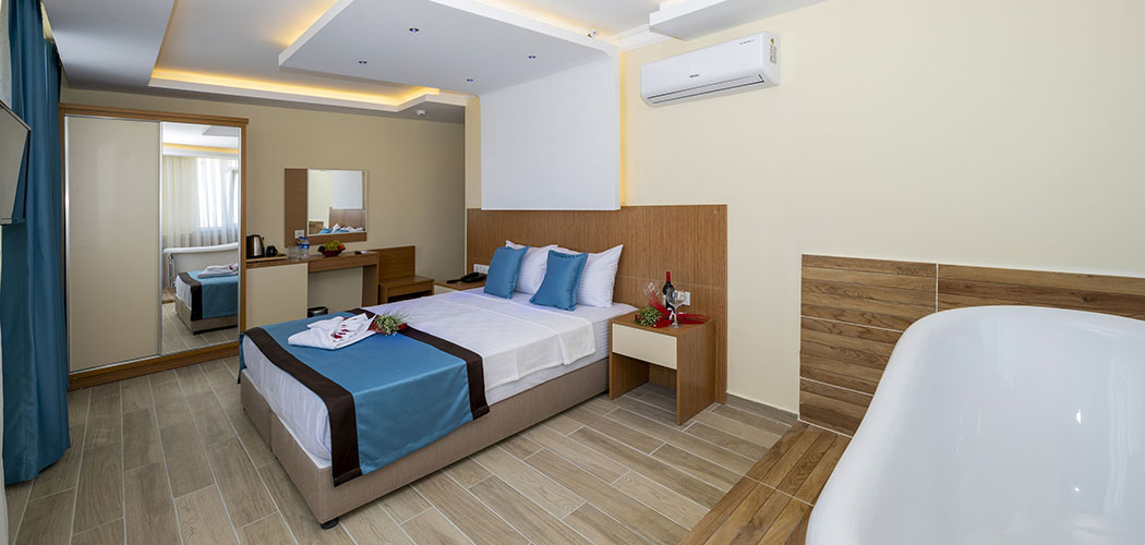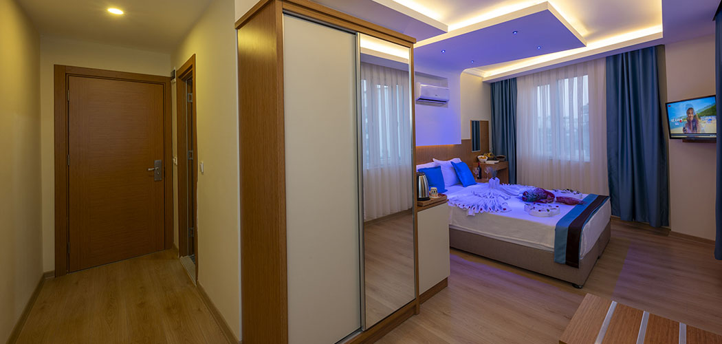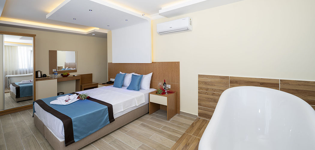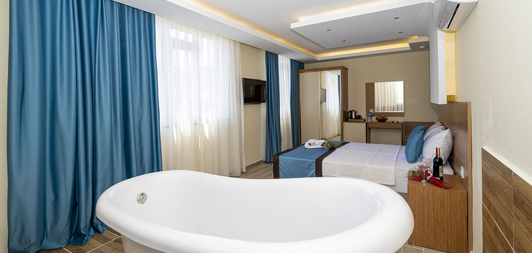The rooms are equipped with electronic door lock, lighting system, minibar, national and international satellite channels, 32 inch lcd tv, direct phone line, safe with password, shower, wc, hair drier, wired & wireless internet connection, tea-coffee set, personal care products, slippers, hand, body and foot towels. Deluxe rooms are additionally equipped with bathrobe.