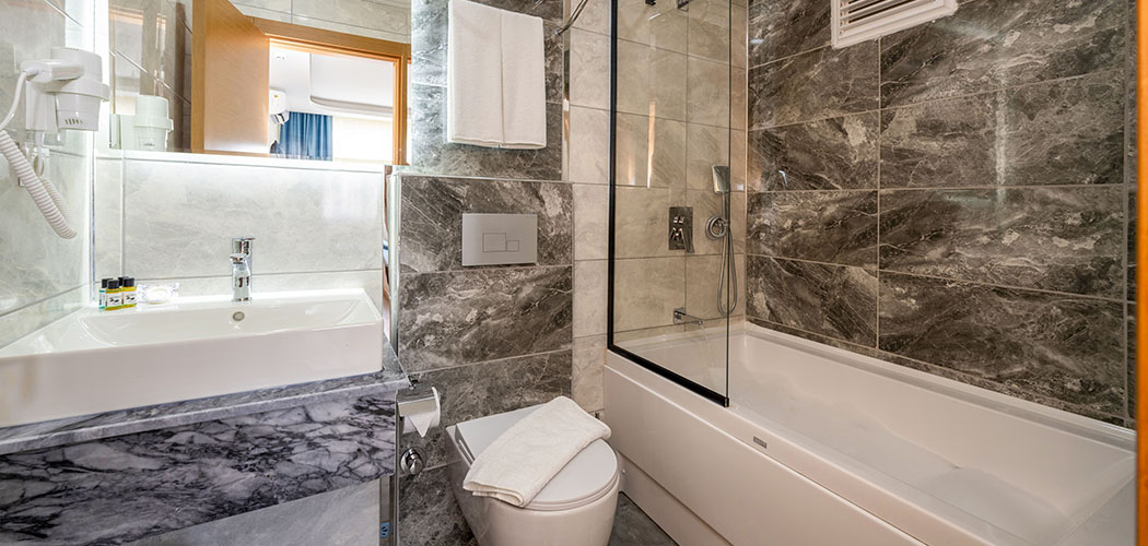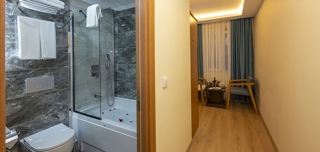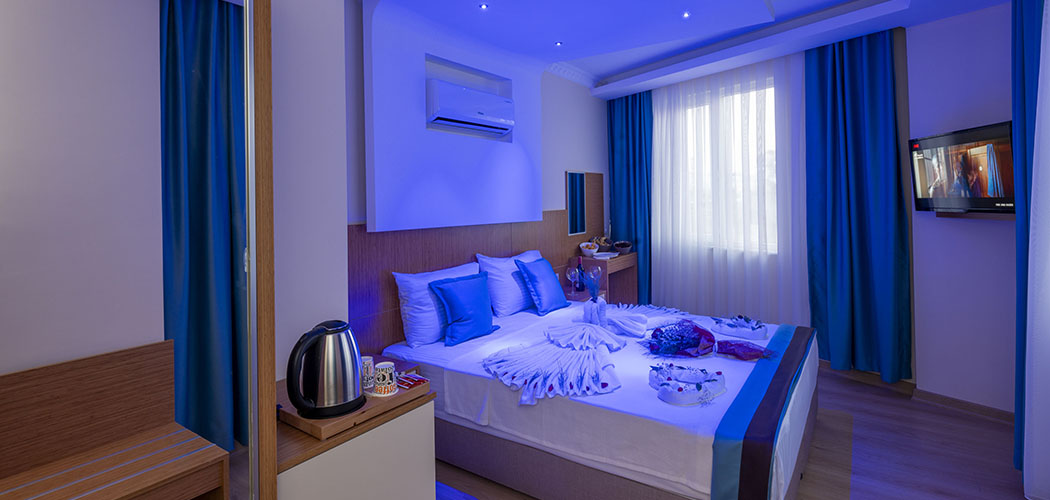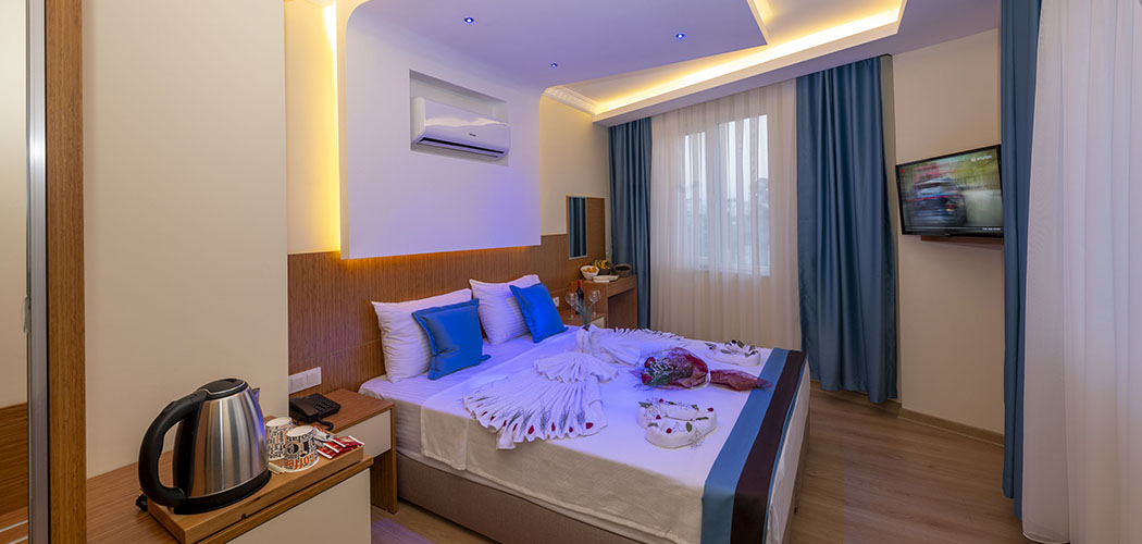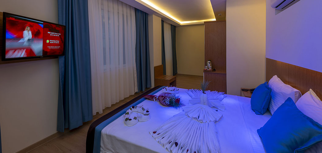 The rooms are equipped with electronic door lock, lighting system, minibar, national and international satellite channels, 32 inch lcd tv, direct phone line, safe with password, shower, wc, hair drier, wired & wireless internet connection, tea-coffee set, personal care products, slippers, hand, body and foot towels. Deluxe rooms are additionally equipped with bathrobe.