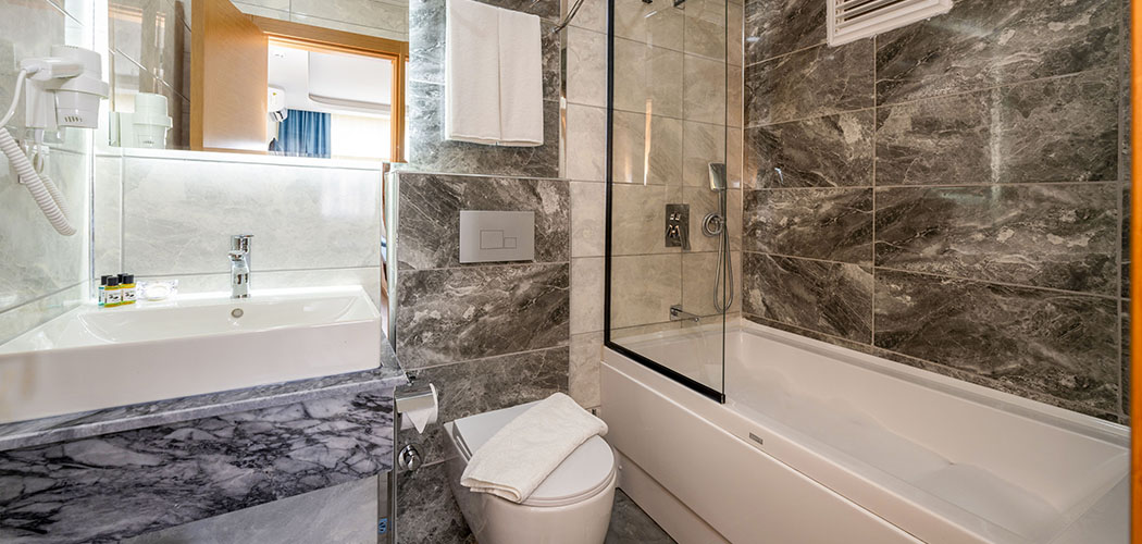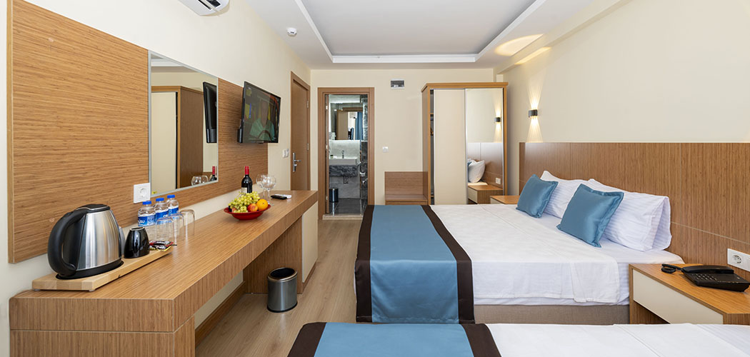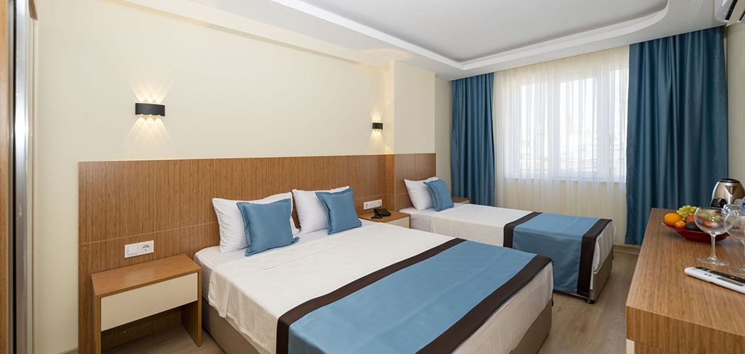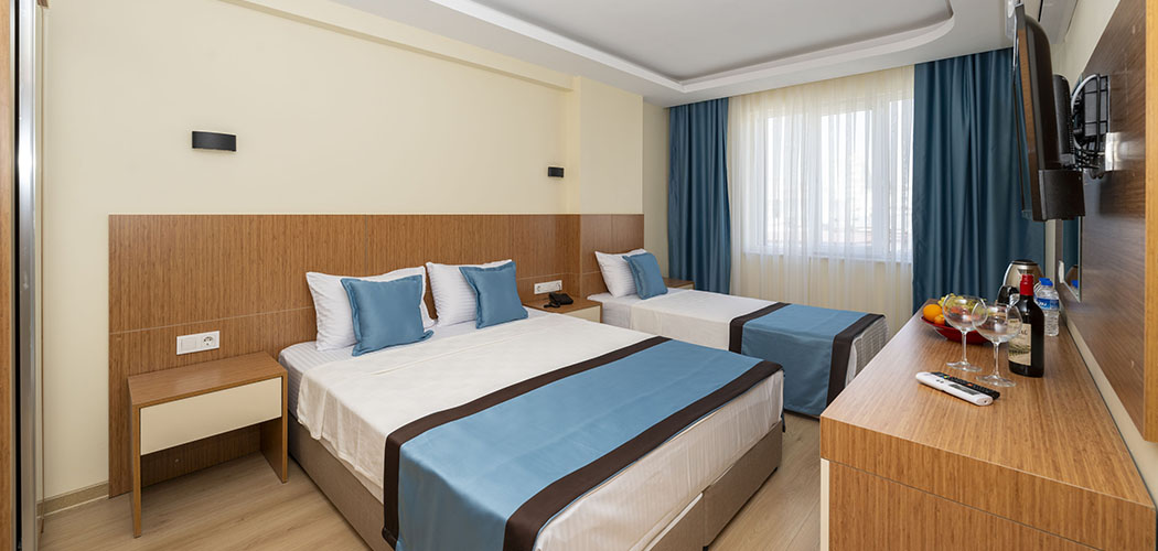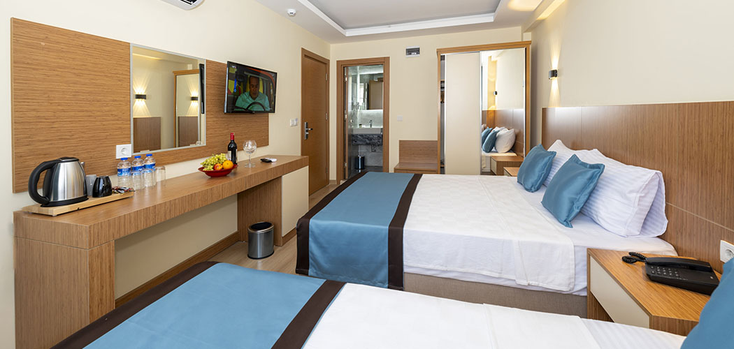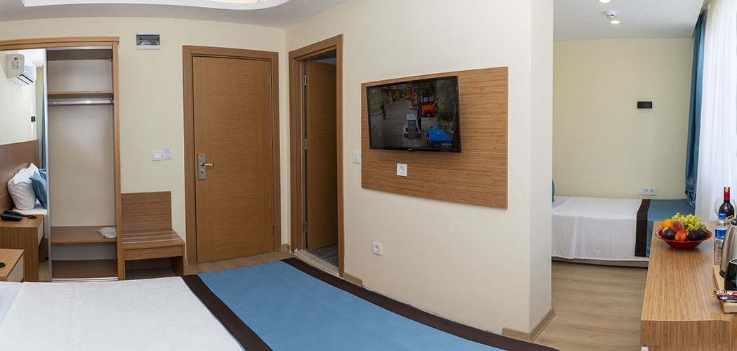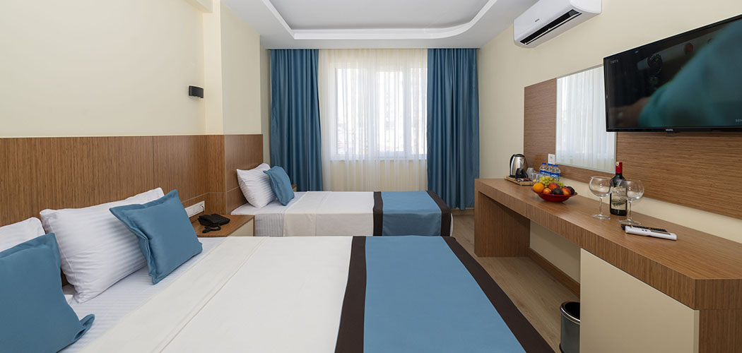 The rooms are equipped with electronic door lock, lighting system, minibar, national and international satellite channels, 32 inch lcd tv, direct phone line, safe with password, shower, wc, hair drier, wired & wireless internet connection, tea-coffee set, personal care products, slippers, hand, body and foot towels. Deluxe rooms are additionally equipped with bathrobe.